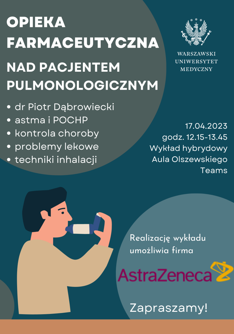 Zapraszamy studentów Farmacji na wykład Pana dr. Piotra Dąbrowieckiego poświęcony opiece farmaceutycznej nad pacjentem pulmonologicznym. Wykład w formie hybrydowej - możliwość uczestnictwa online (Teams) lub stacjonarnie na auli Olszewskiego. 17.04, g. 12.15-13.45. Wykład realizowany dzięki wsparciu firmy AstraZeneca.